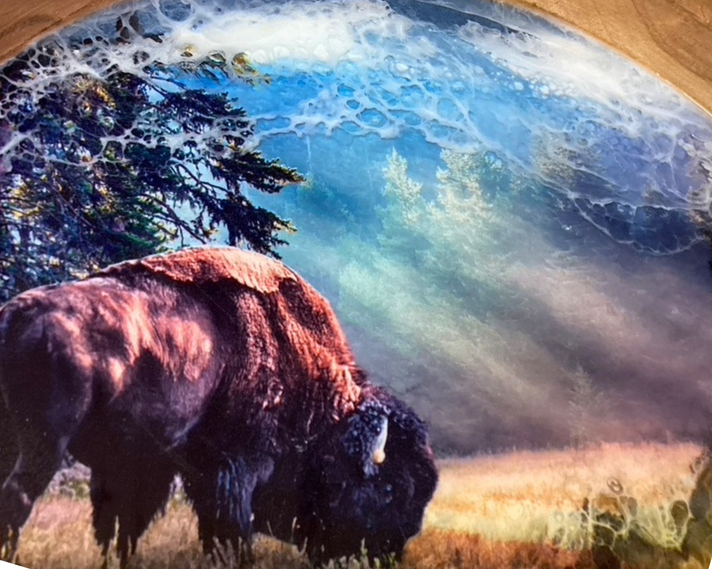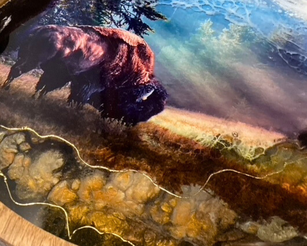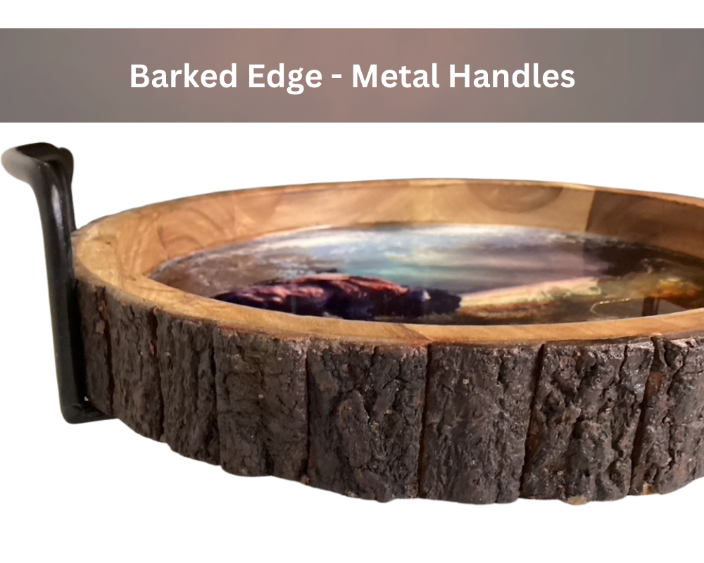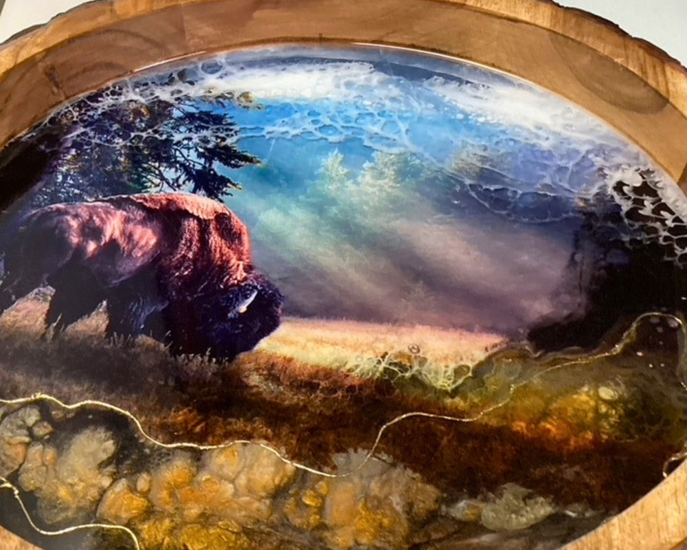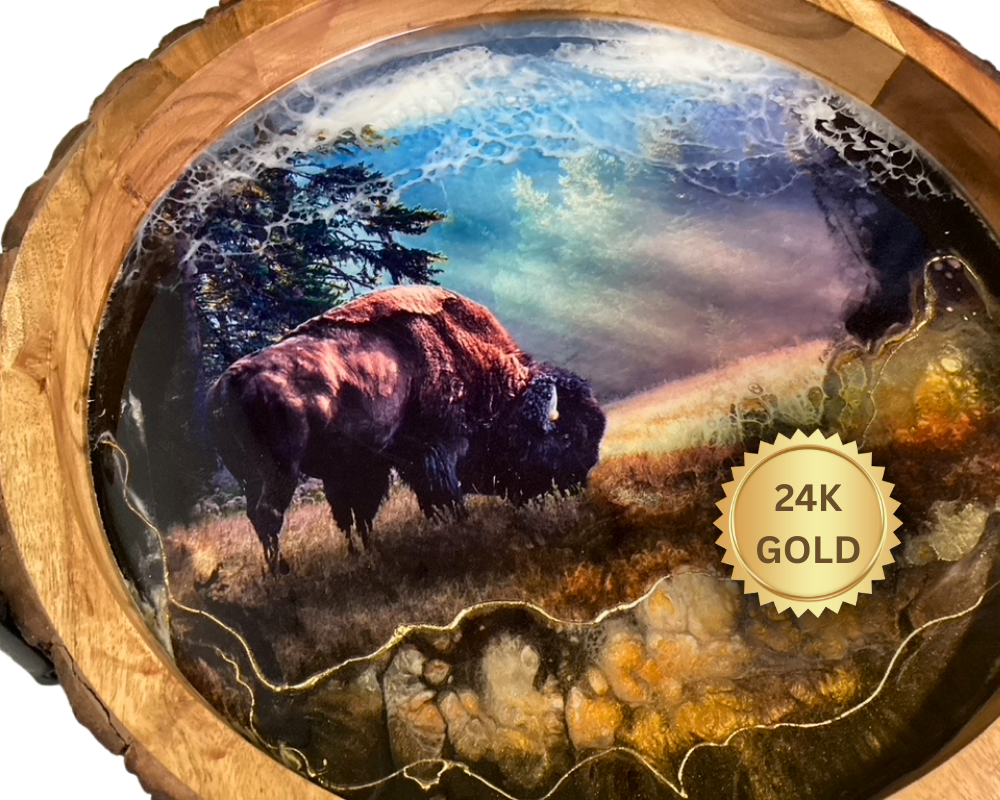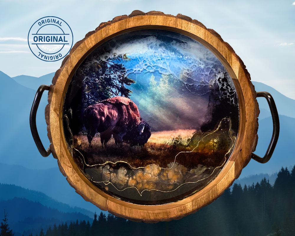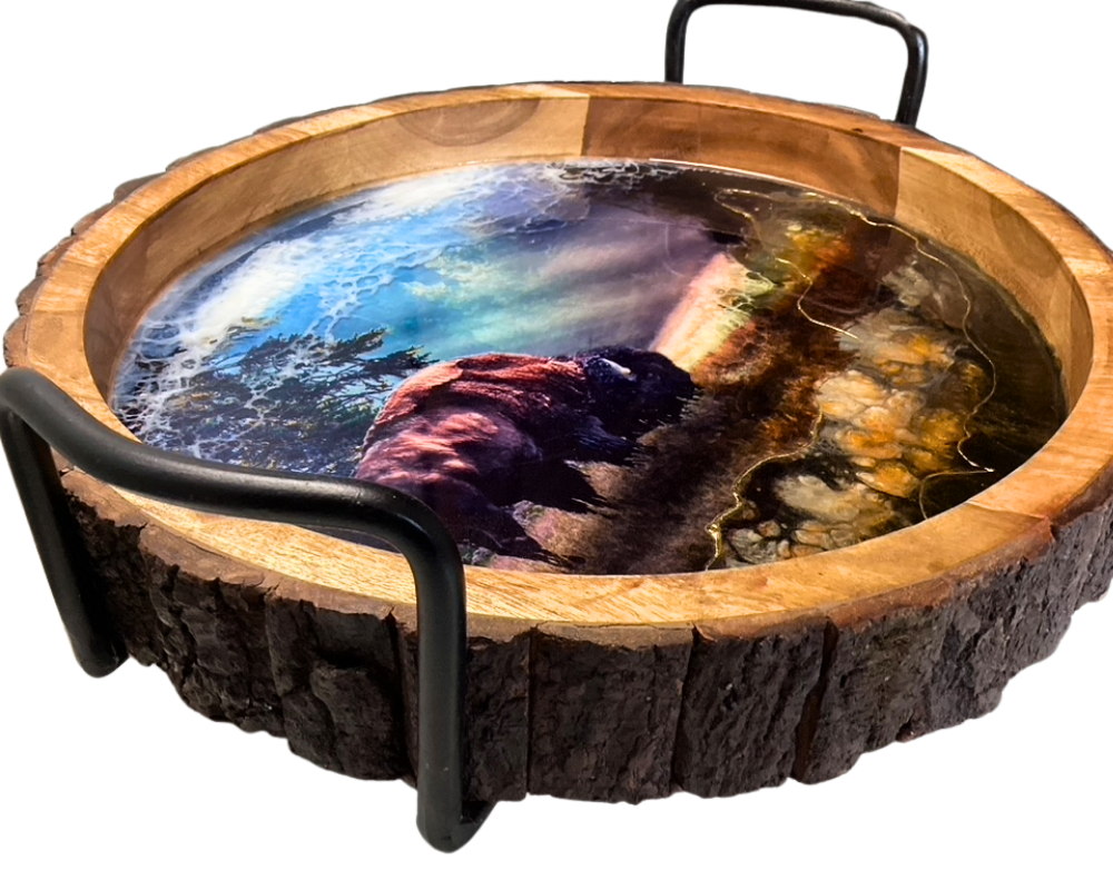 There is something timeless about a quiet moment in the mountains, and this tray carries a bit of that feeling with it. The natural wood grain frames a peaceful bison scene, captured in layers of artwork and resin with soft touches of 24k gold. It works beautifully for serving guests, yet feels just as much at home displayed as a centerpiece or resting on a coffee table.