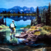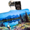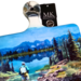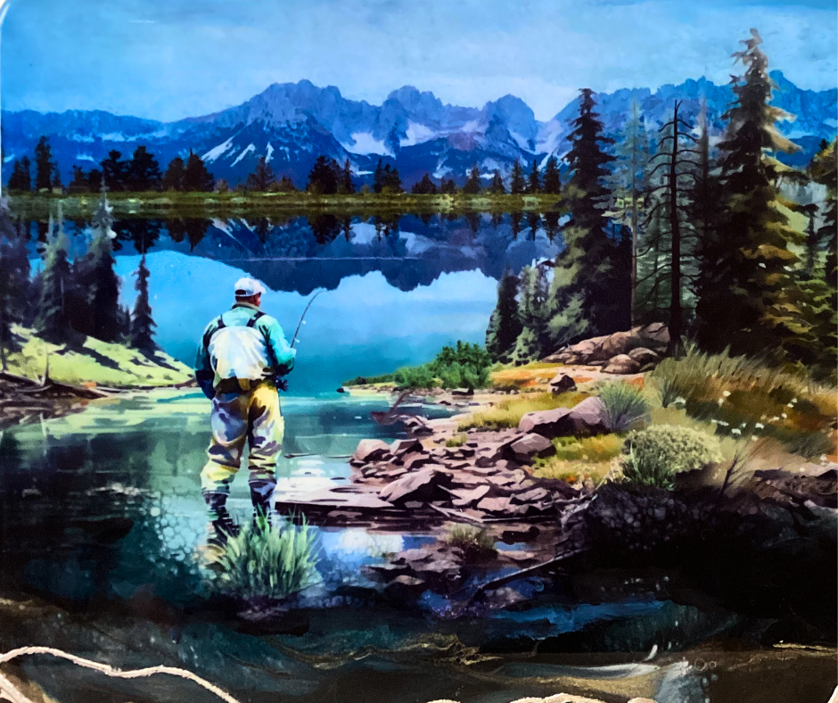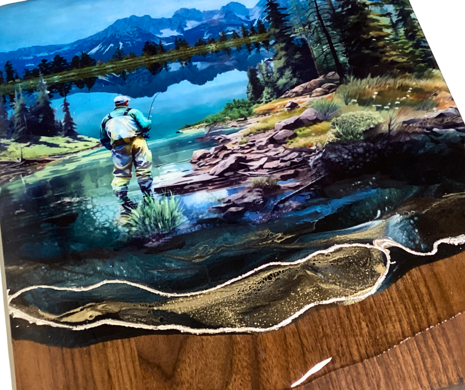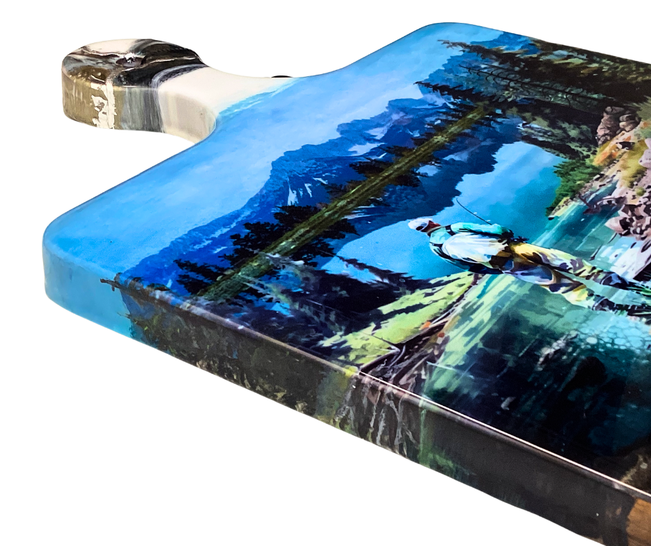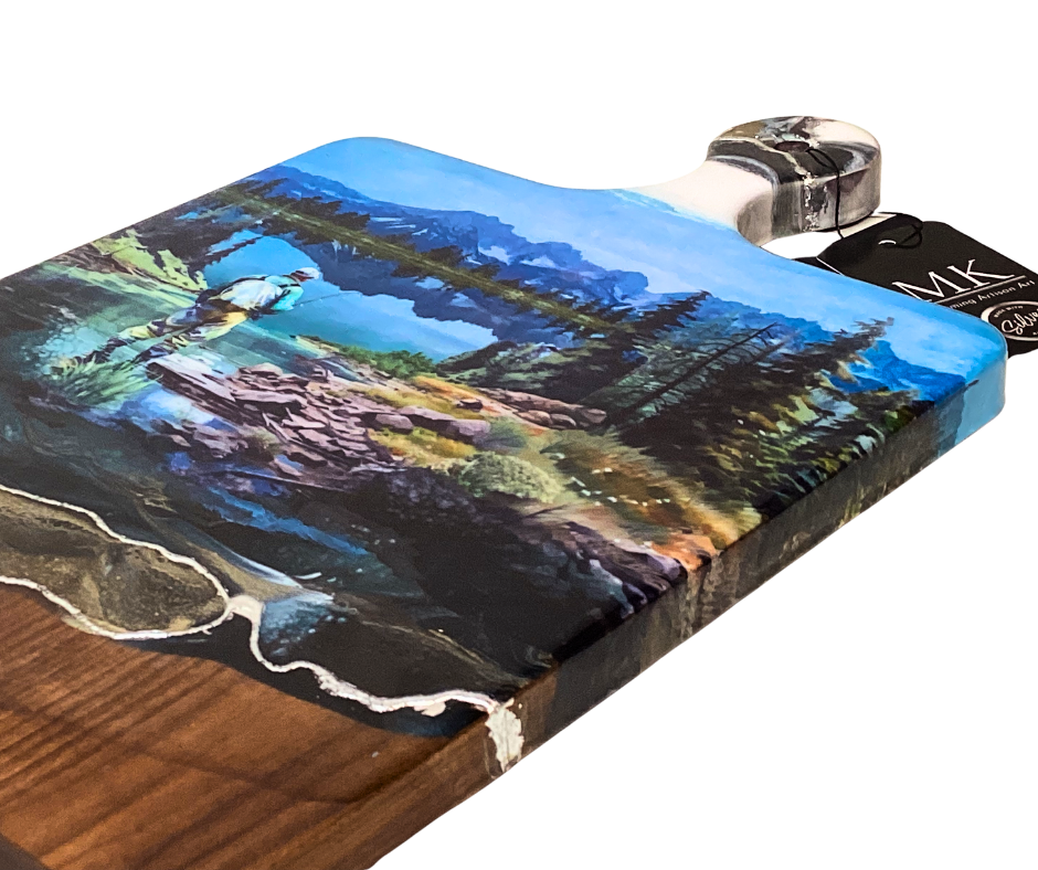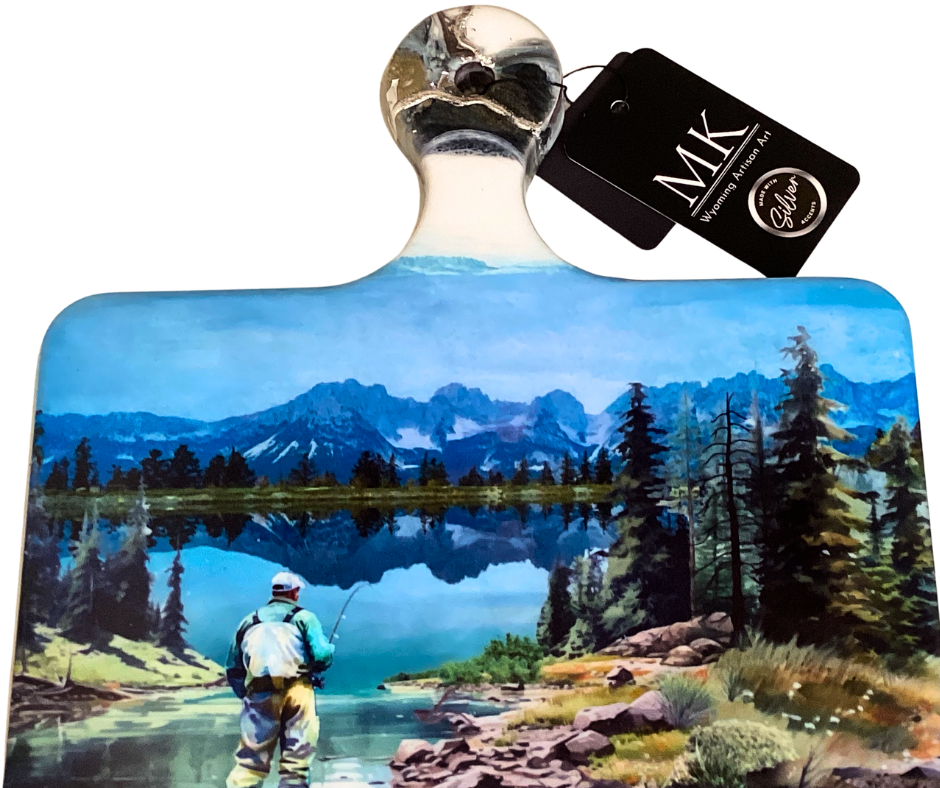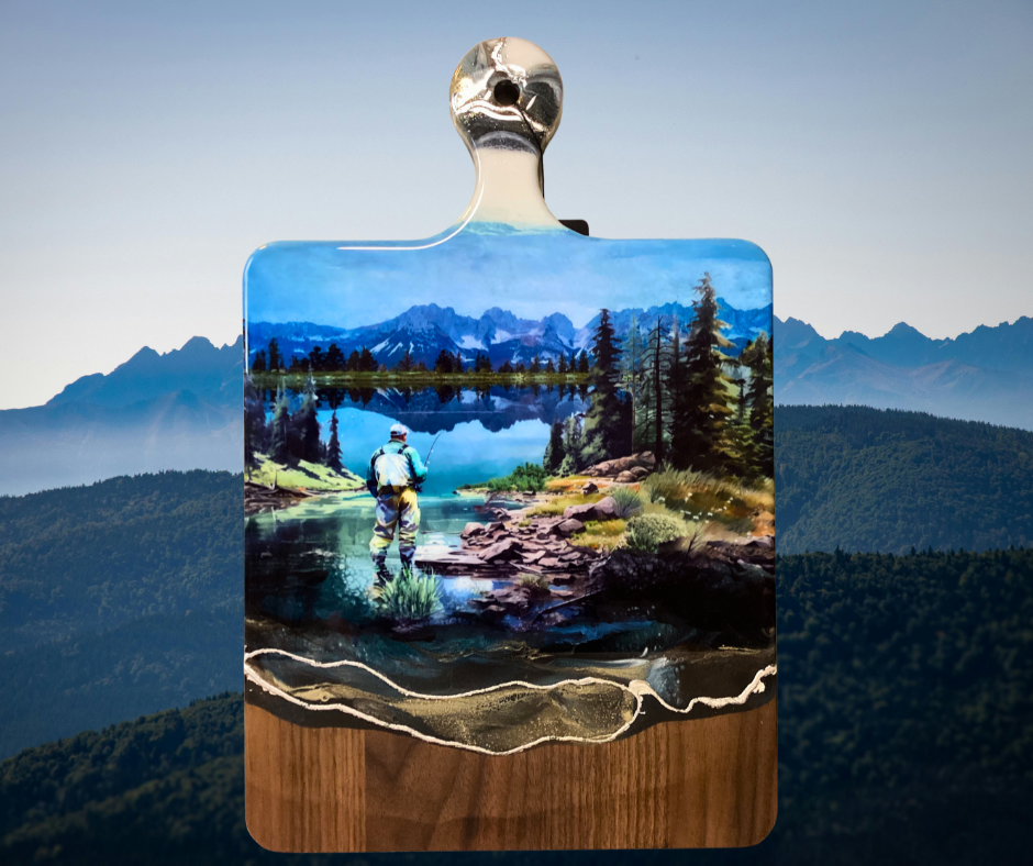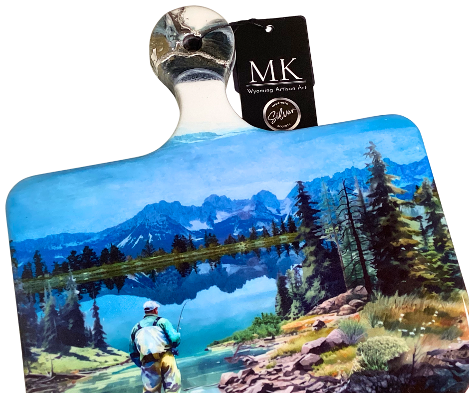 This one-of-a-kind charcuterie board is handcrafted from solid walnut wood and measures 16 x 10.5 inches. The scene features a fly fisherman fishing an outlet stream, framed by the iconic Grand Tetons in the background. A photographic image of the Tetons was thoughtfully combined with hand-painted details to create a fully cohesive landscape that feels immersive and serene. Ribbons of pure silver are layered into the design, adding depth, movement, and a refined touch of luxury. Finished with a food-safe topcoat, this board is designed to be both functional for serving and striking as a display piece.