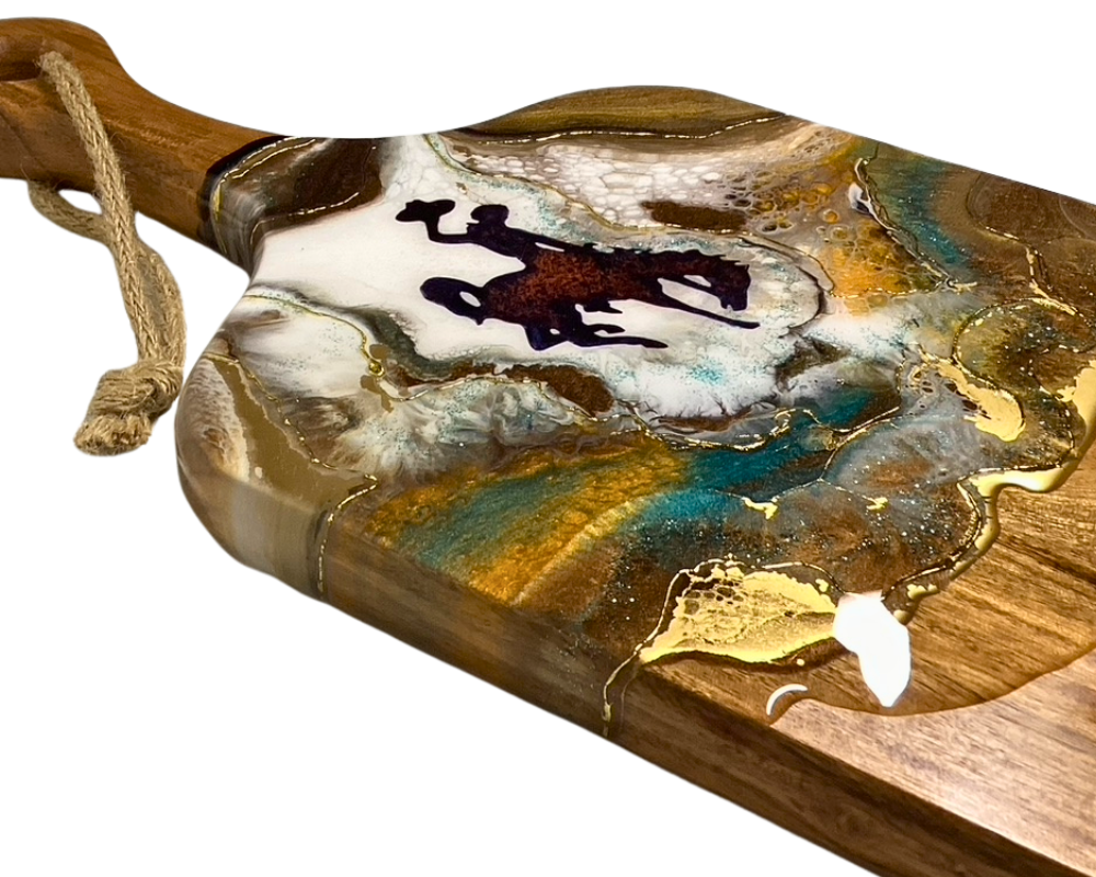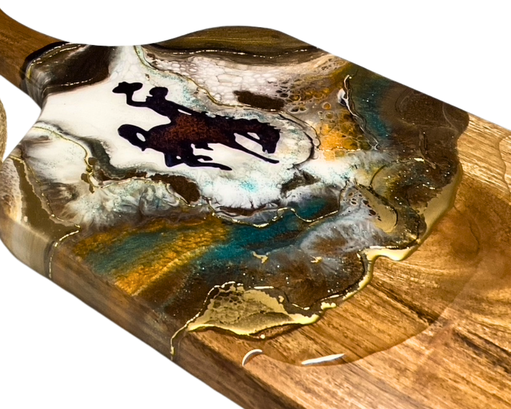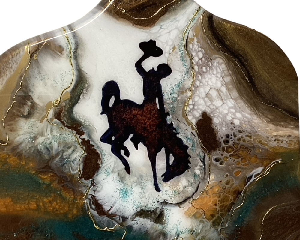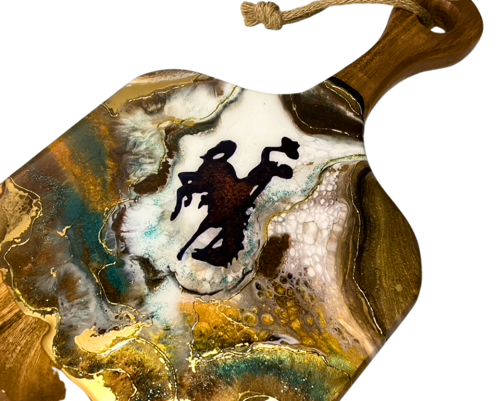 This handmade Wyoming Cowboy Charcuterie Board celebrates Western pride and craftsmanship. The Wyoming Cowboy trademark stands proudly at the center, framed by original resin artwork in rich tones of brown, gold, white, and turquoise. Subtle ribbons of 24K gold and a dusting of turquoise glitter catch the light, adding depth and sparkle to every viewing angle.