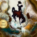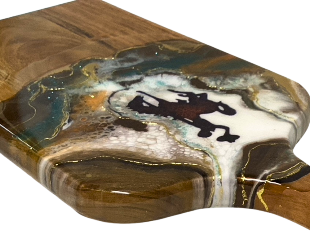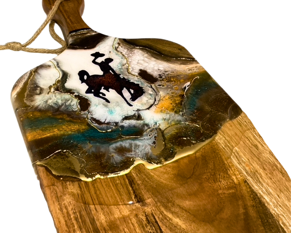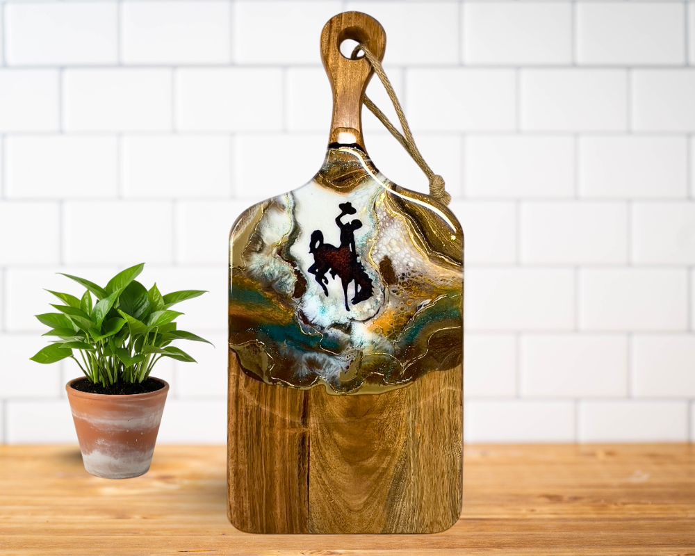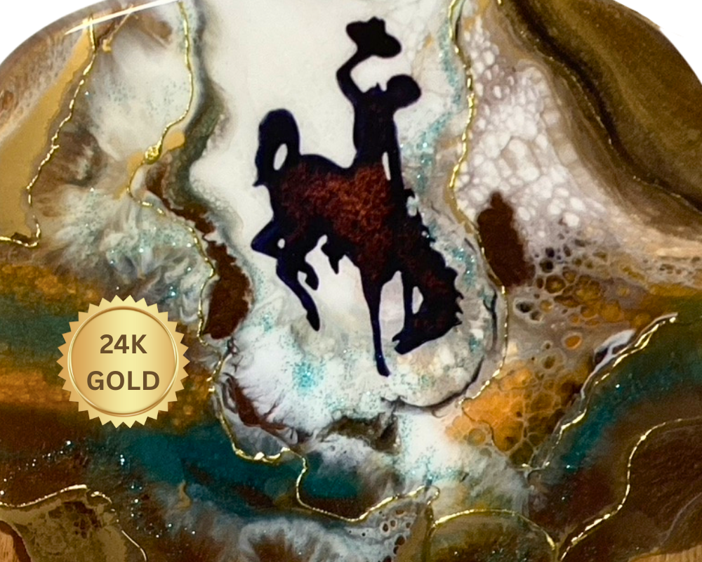 This handmade Wyoming Cowboy Charcuterie Board celebrates Western pride and craftsmanship. The Wyoming Cowboy trademark stands proudly at the center, framed by original resin artwork in rich tones of brown, gold, white, and turquoise. Subtle ribbons of 24K gold and a dusting of turquoise glitter catch the light, adding depth and sparkle to every viewing angle.